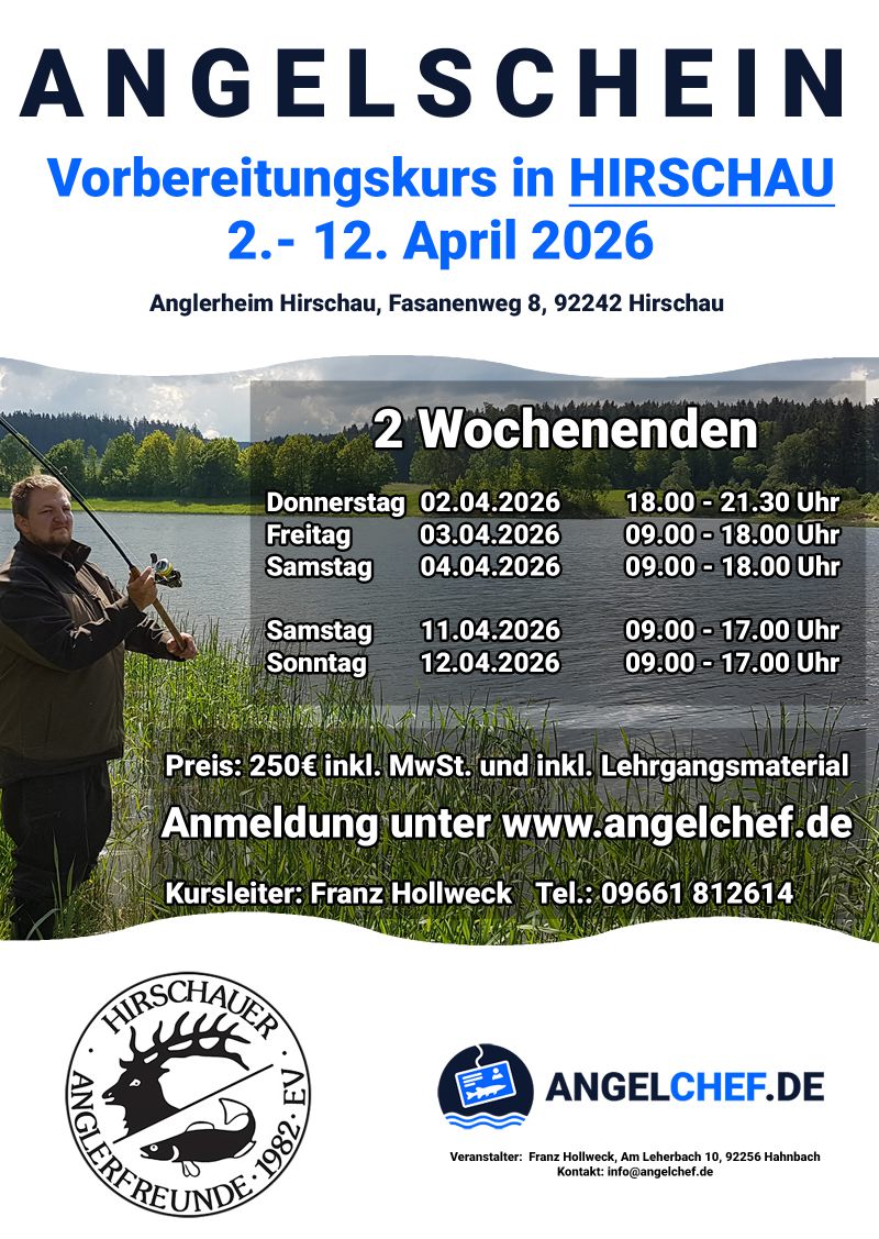 Im April 2026 findet im Anglerheim der Hirschauer Anglerfreunde wieder ein Vorbereitungskurs zur staatlichen Fischerprüfung statt.